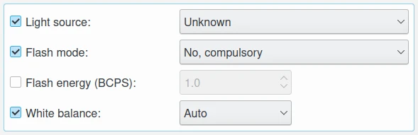 Programa de exposição: esta caixa de seleção permite editar o programa usado pela câmera para definir a exposição quando a foto foi tirada. Os valores possíveis são Não definido, Manual, Automático, Prioridade de abertura, Prioridade do obturador, Programa criativo, Programa de ação, Modo retrato e Modo paisagem.