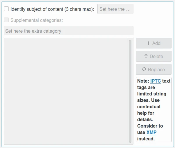 Assuntos pré-configurados podem ser usados para descrever o conteúdo dos itens com base nos códigos de referência do IPTC. Todos os campos de texto na aba IPTC têm tamanho limitado. Considere usar a aba XMP. Alguns campos podem aceitar múltiplas entradas anexadas à lista. Itens com múltiplas entradas podem ser gerenciados com os botões Adicionar, Excluir e Substituir localizados próximos à lista editada.