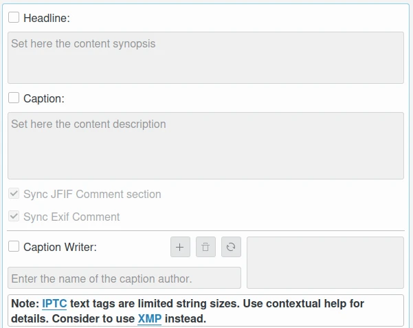 Legenda: esta caixa de seleção permite editar as descrições do conteúdo. O valor padrão do idioma alternativo da legenda pode ser sincronizado com a seção de comentários do JFIF e os comentários do Exif.