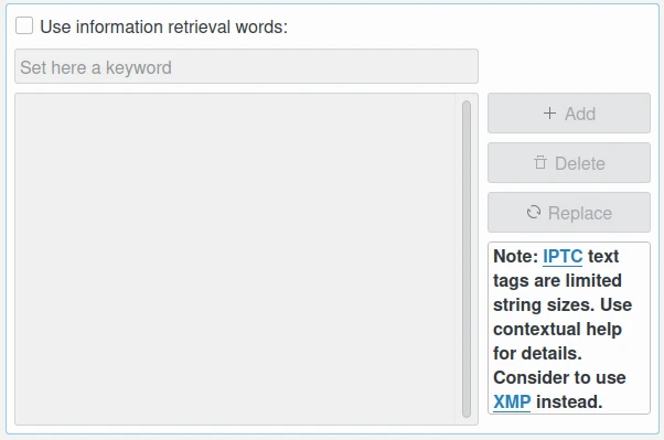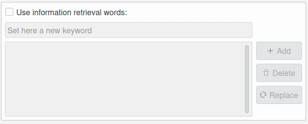 A caixa de seleção Usar as palavras de recuperação de informações permite editar a lista de palavras-chave usadas para definir o conteúdo. Um campo de texto abaixo permite inserir uma nova palavra-chave, limitada a 64 caracteres. Use o botão Adicionar para anexar a nova palavra-chave à lista. O botão Excluir remove uma entrada da lista e o botão Substituir altera o item selecionado na lista pelo valor da palavra-chave editada.