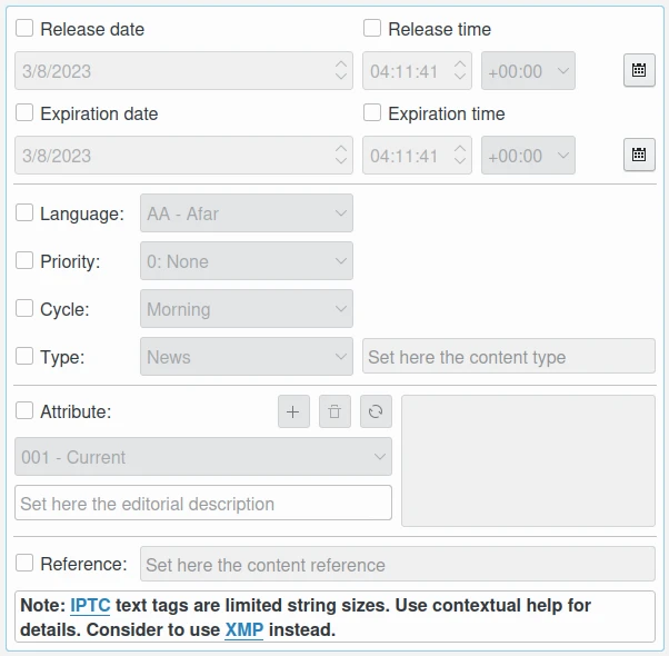 Data de criação: esta caixa de seleção permite editar a data e o fuso-horário do conteúdo intelectual. Use o widget do editor de calendário na parte inferior para selecionar o carimbo de data/hora e o botão à direita para redefinir o carimbo de data/hora para a data atual do computador. Esses valores podem ser sincronizados com a Data de criação do Exif.