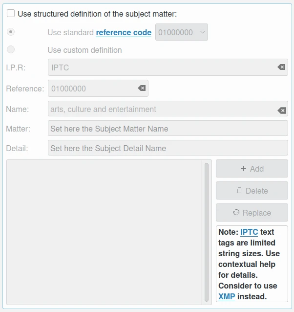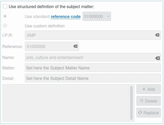 Usar uma definição estruturada da matéria do assunto: esta caixa de seleção permite editar os Códigos de assunto da taxonomia IPTC/NAA, com foco no texto. Consiste em cerca de 1.400 termos estruturados em 3 níveis. A opção Usar o código de referência permite selecionar a taxonomia padrão, e a opção Usar definição personalizada permite personalizar os valores. Mais de uma entrada pode ser anexada a uma lista de referências.