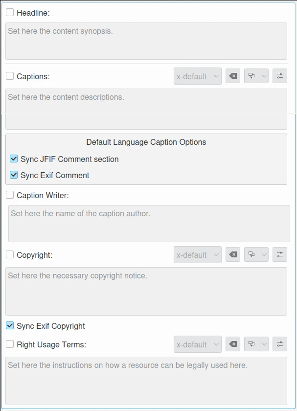 Direitos autorais: esta caixa de seleção permite editar os avisos de direitos autorais necessários. O valor padrão de idioma alternativo para direitos autorais pode ser sincronizado com o direitos autorais do Exif.