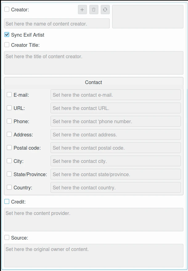 Criador: esta caixa de seleção permite editar os nomes dos criadores do conteúdo. Várias entradas de texto podem ser adicionadas à lista. O valor padrão do idioma alternativo do criador pode ser sincronizado com o artista do Exif.