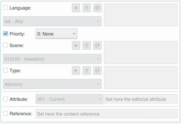 Atributo: esta caixa de seleção permite selecionar os atributos editoriais do conteúdo e editar as descrições dos atributos editoriais. Várias entradas podem ser adicionadas à lista.