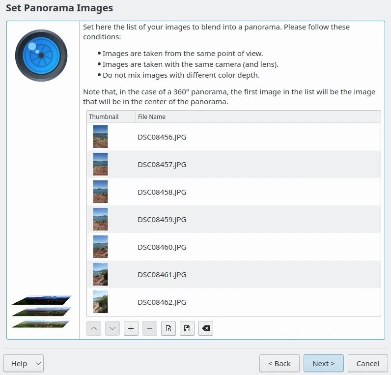 Se necessário, reorganize as imagens na ordem correta usando os botões Para cima e Para baixo. Use os botões com os símbolos Mais e Menos para adicionar ou remover itens. Se quiser renderizar uma panorâmica de 360°, a primeira imagem da lista será o item colocado no centro da panorâmica. Quando terminar, clique no botão Próximo.