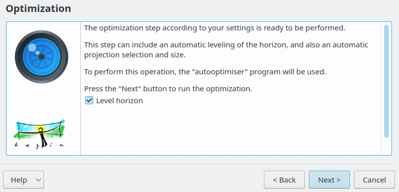 A página de otimizações inclui outra opção chamada Nível de horizonte, dedicada ao uso com cenas horizontais. Ative esta configuração para detectar o horizonte e adaptar a projeção de acordo. O horizonte detectado será uma linha horizontal no panorama final. Se a sua cena for uma composição vertical, você pode ignorar esta configuração. Clique no botão Próximo para visualizar o resultado.