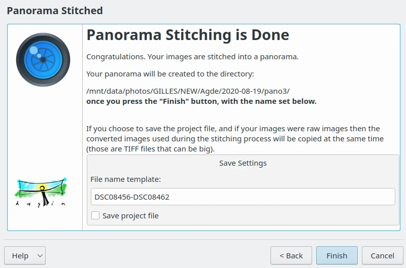 Após um longo cálculo, a costura panorâmica estará concluída e a ferramenta proporá um nome de modelo para o arquivo de destino. Se desejar, você também pode salvar seu projeto em um formato compatível com o Hugin. Clique no botão Concluir e você verá o resultado no mesmo Álbum das suas fotos originais.