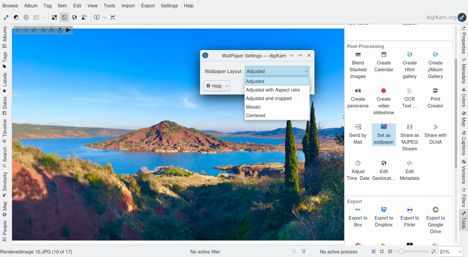 A ferramenta Papel de parede permite definir uma imagem da sua coleção como foto de fundo na sua área de trabalho. Se você usa um computador com várias telas, a imagem é atribuída ao monitor atual onde o digiKam está sendo executado.