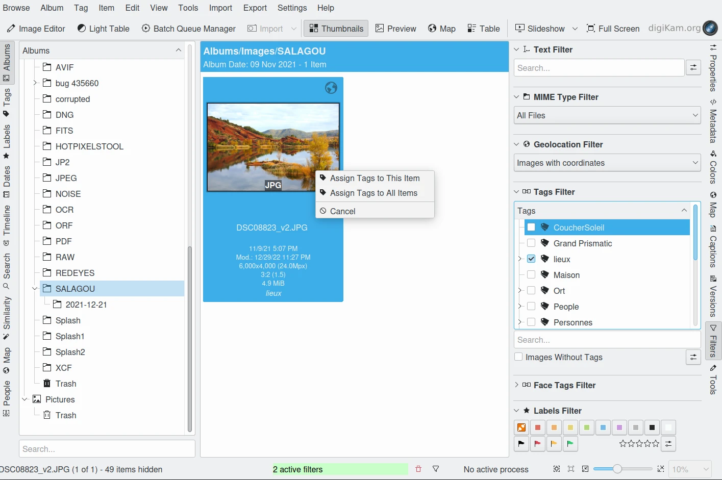 No exemplo acima, a janela principal mostra as imagens de um álbum. O filtro de etiquetas está definido como “Lieux”, o que reduz o conjunto para 3 imagens. No Filtro de geolocalização, selecionamos Imagens com coordenadas, o que deixa apenas uma foto da lista de itens, incluindo informações de GPS. Em seguida, uma etiqueta é arrastada do Filtro de etiquetas sobre a miniatura e solta. Uma caixa de diálogo pop-up pergunta se a etiqueta deve ser aplicada apenas a este item ou a todos os itens (exibidos).