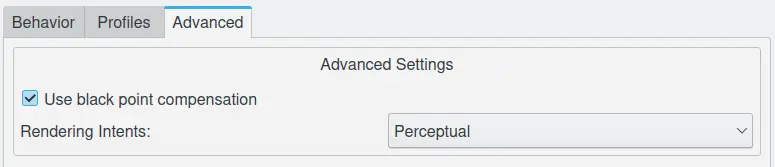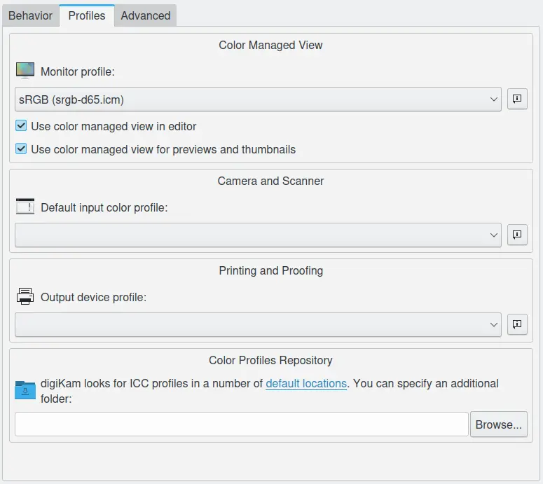 A aba Comportamento contém muitas opções de gerenciamento de cor no digikam.