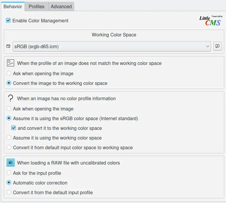 Se o gerenciamento de cor estiver habilitado, você deverá selecionar um perfil de Espaço de cor de trabalho. As opções incluem perfis lineares como sRGB, ECI-RGB, LStar-RGB, Adobe-RGB e CIE-RGB, entre outros. Se você deseja imprimir suas imagens, pode optar por Adobe RGB. Se suas imagens forem apenas para exibição na web, sRGB é uma escolha melhor. (Adobe RGB será exibido um pouco opaco em softwares sem gerenciamento de cor habilitado, como navegadores.) No entanto, você pode alterar esse perfil a qualquer momento selecionando outro perfil. Assim, o Adobe RGB pode ser uma boa opção para armazenamento e processamento de imagens, pois você sempre pode alterá-lo para sRGB antes de lançar uma imagem para seu blog. Observação: não use perfis não lineares, pois eles alterarão o balanço de cor de suas imagens.