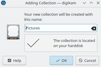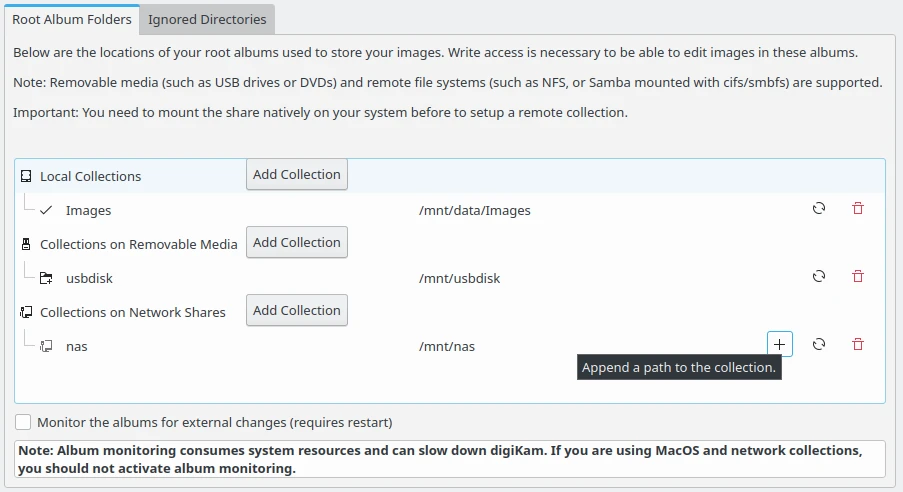 As Pastas raiz dos álbuns listam três tipos de coleção que podem ser referenciadas no digiKam: