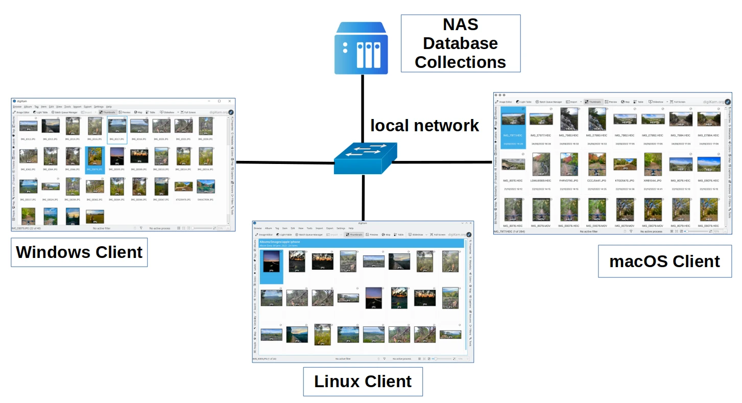 Coleções em compartilhamentos de rede: são pastas raiz dos álbuns armazenados em sistemas de arquivos remotos, como Samba ou NFS, que são montados como nativos no seu sistema.