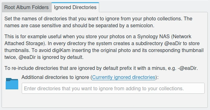 A aba de Pastas ignoradas permite configurar a lista de pastas a serem ignoradas durante a verificação do conteúdo da coleção. Os nomes das pastas diferenciam maiúsculas de minúsculas e devem ser separados por ponto e vírgula. A lista de pastas ignoradas não inclui caminhos que o digiKam ignora por padrão, como pastas que começam com um ponto. Clique no link Pastas atualmente ignoradas para exibir a lista de pastas que o digiKam ignora por padrão.