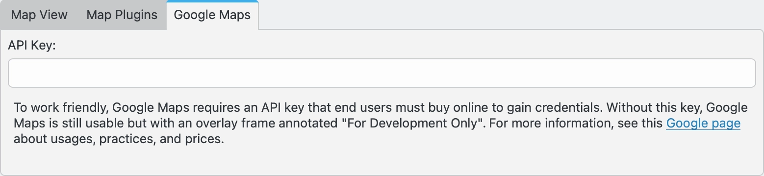 A aba Google Maps permite que você insira uma chave de API para usar o Google Maps. O Google Maps pode ser usado sem essa chave, mas sobreporá os mapas com as palavras “For development purposes only”. Consulte esta página para obter mais informações.