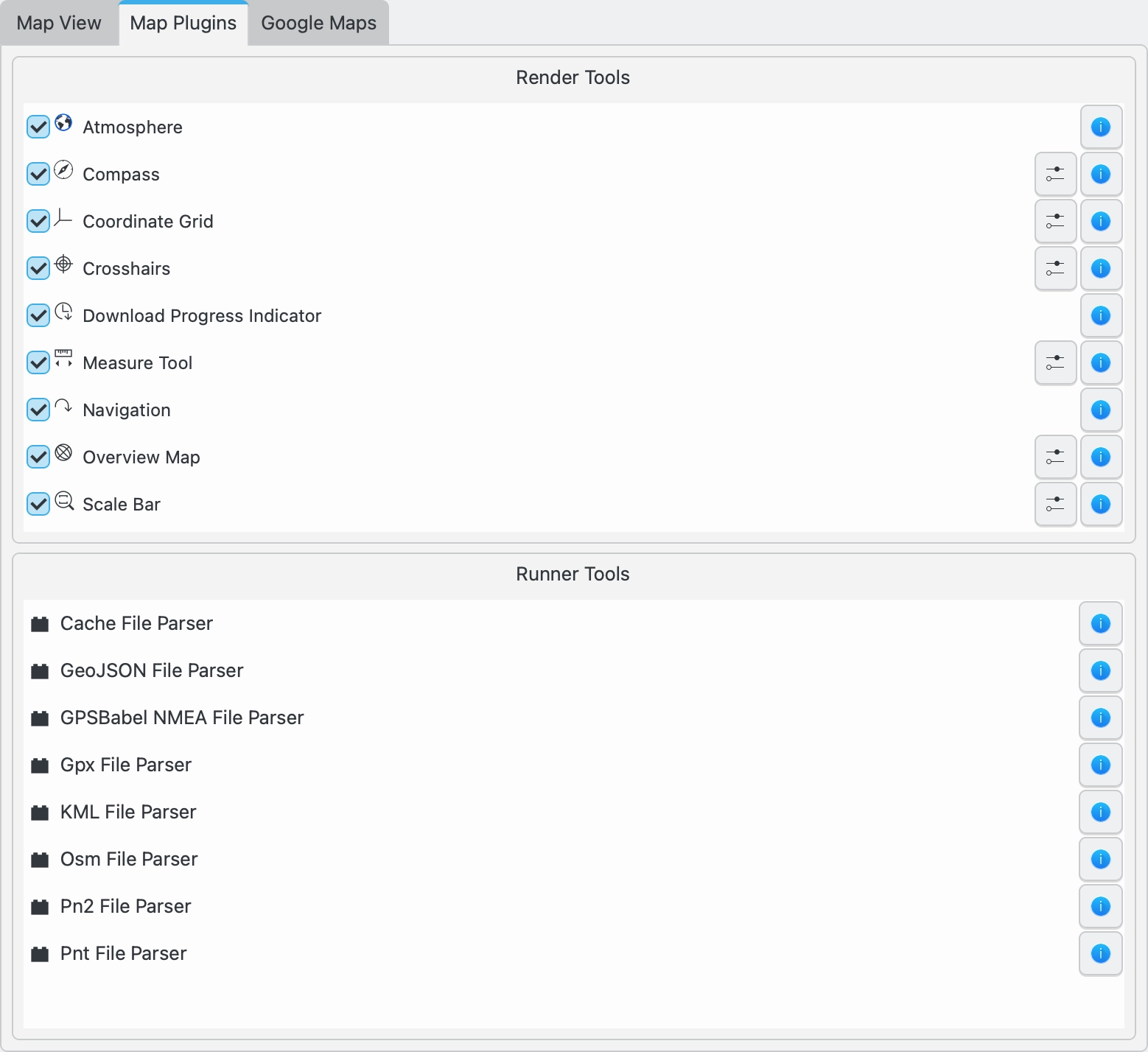 Os plugins de execução usados para analisar arquivos GPS também são listados.