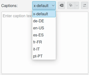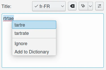 Na parte superior de um widget do editor de texto, você pode selecionar a entrada de tradução para o texto. O menu suspenso mostrará apenas os idiomas de sua preferência definidos na página de configuração. O próximo botão à direita limpa a entrada traduzida atual. O próximo botão suspenso cria uma nova entrada de tradução usando o tradutor online configurado. Por fim, o último botão à direita exibe a página de configurações de localização para personalizar o comportamento da tradução.