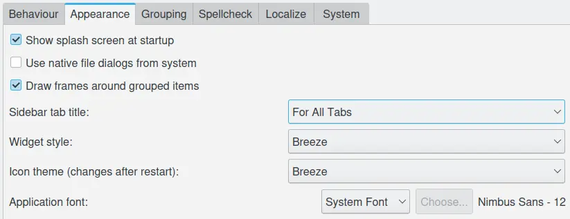 A opção Tema de ícones seleciona o tema padrão para os ícones do aplicativo. A disponibilidade do tema depende do sistema operacional. O conjunto de ícones Breeze geralmente é a melhor escolha para todos os sistemas operacionais.