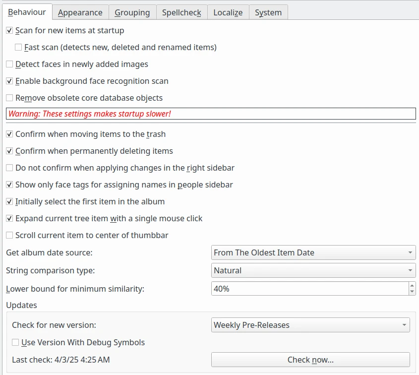 Todas essas opções podem causar latência durante o uso do digiKam ou na inicialização do aplicativo. Habilite essas opções somente se souber o que está fazendo.