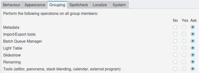 Para cada classe de operações, você pode selecionar se o digiKam aplica a operação comandada a todos os itens dentro de um grupo: