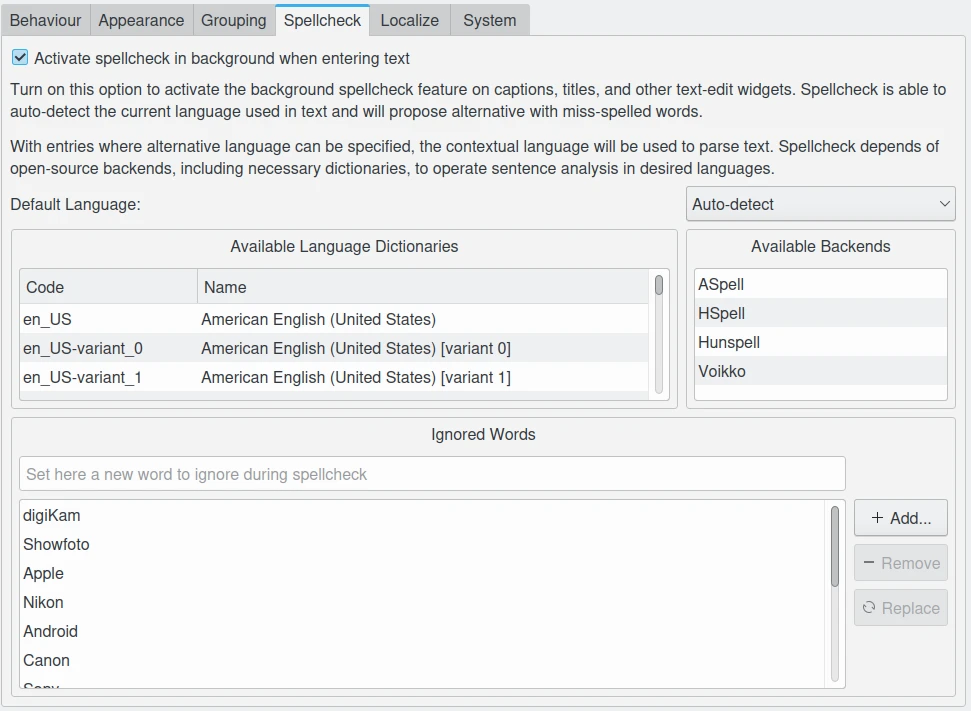 A verificação ortográfica pode ser usada em legendas, títulos e outros widgets de edição de texto para identificar erros de ortografia e propor correções. O digiKam detecta automaticamente o idioma usado na verificação ortográfica, já que muitos campos de entrada de texto suportam vários idiomas. A verificação ortográfica depende de Backends de código aberto, incluindo Dicionários de idiomas, para realizar a análise de frases. Os backends e idiomas disponíveis estão listados nesta aba para sua informação. Se desejar adicionar novos idiomas ou dicionários, você precisará instalar os pacotes relevantes em seu sistema.