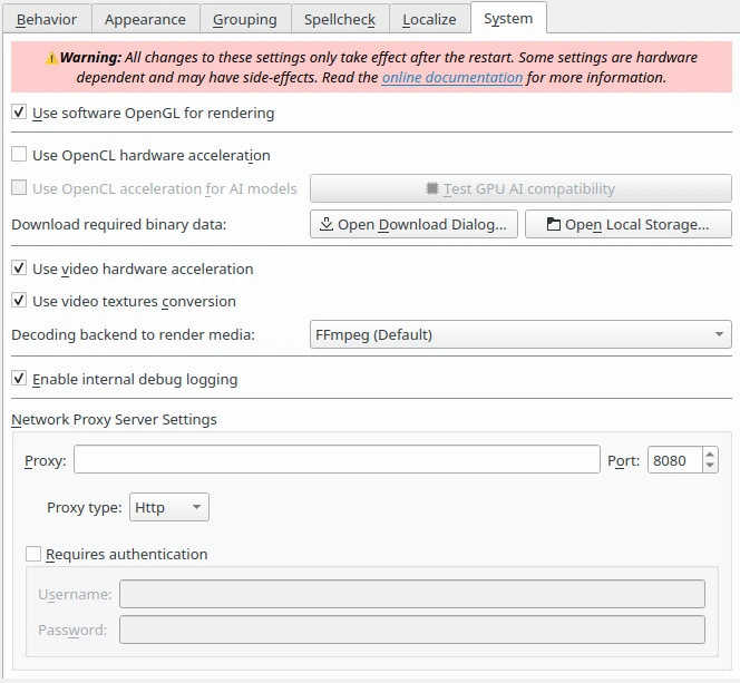 Após concluir essas etapas, reinicie o digiKam e execute novamente o teste de compatibilidade na caixa de diálogo Configuração > Diversos > Sistema.