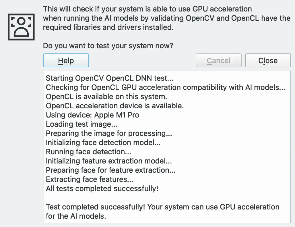 Usar a aceleração por hardware do OpenCL: esta opção habilitará a aceleração por hardware da GPU com os recursos de gerenciamento de rostos, verificação da qualidade de imagem e etiquetas automáticas. Esta opção afeta o mecanismo OpenCV usado em segundo plano para computação intensiva em imagens. Para ver os detalhes sobre o suporte de hardware OpenCV, acesse o item de menu e consulte a Seção OpenCV na caixa de diálogo.