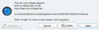 Basta clicar no botão Instalar para concluir a instalação. A sessão atual do digiKam será encerrada e o instalador será iniciado.