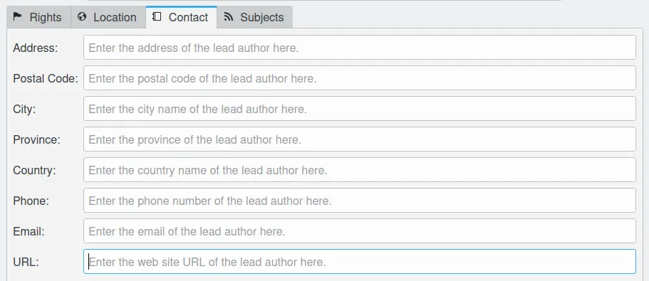Os dados na aba Contato referem-se ao fotógrafo (principal) em Nomes dos autores na aba Direitos. Como esses campos não existem no IPTC, um extrato das especificações XMP para esses campos está listado abaixo: