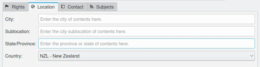 A aba Localização contém os dados padrão sobre o local no mundo que descreve o conteúdo. Este é um extrato das especificações IPTC/XMP para estes campos: