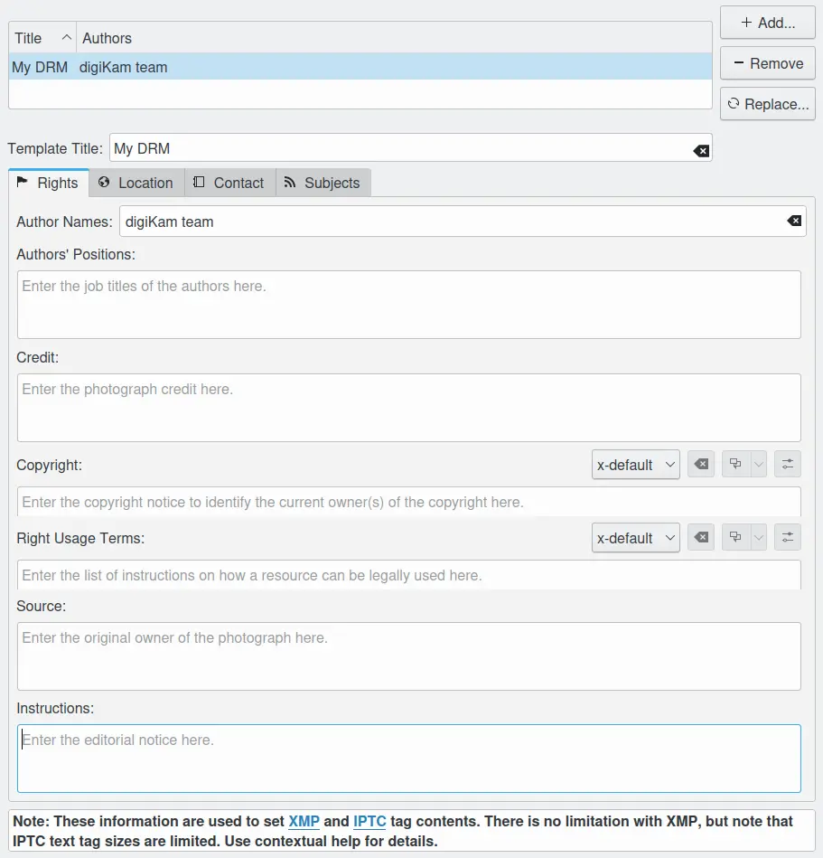 O objetivo dos modelos é aplicar vários metadados a um ou mais itens simultaneamente. Você pode criar diversos perfis correspondentes a diferentes aspectos do seu fluxo de trabalho. Em todos os casos, as informações serão armazenadas no arquivo como metadados XMP ou IPTC. Lembre-se de que o XMP substitui o IPTC, conforme explicado nesta seção do manual.