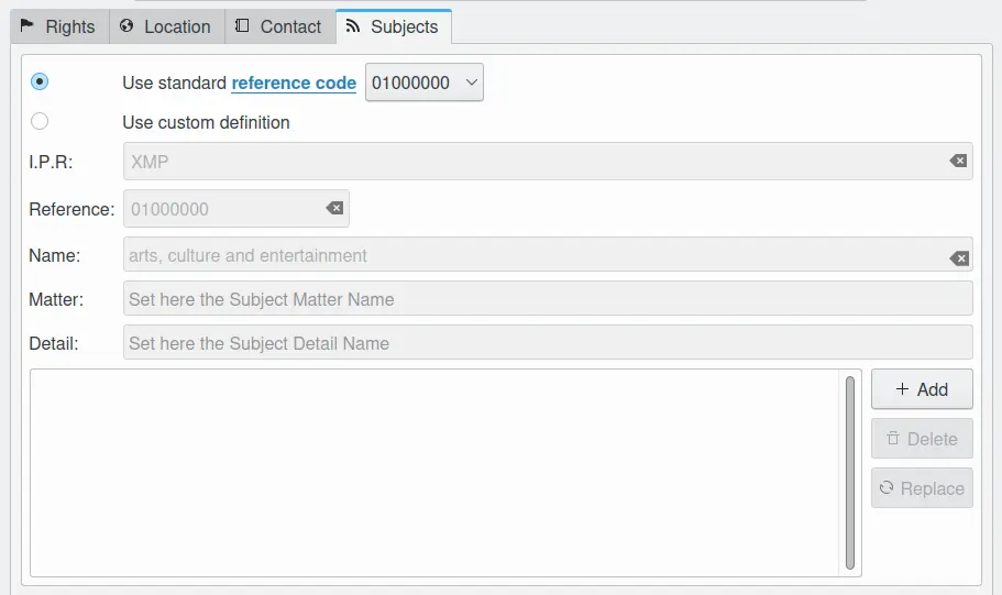 Na aba Assuntos você pode atribuir um ou mais códigos de assunto ao modelo de acordo com o Padrão de Metadados de Fotos do IPTC. Se a primeira opção Usar o código de referência estiver selecionada, você pode escolher um código no campo suspenso e o significado dele aparecerá nos campos da seção Usar definição personalizada. Se você não souber o código do assunto que deseja atribuir, esse método é um pouco tedioso, pois há 1.400 assuntos padrão. Uma maneira melhor é procurar seu assunto nesta URL. Lá, você seleciona Códigos de assunto e seu idioma (recomenda-se inglês) e clica em Mostrar. Você pode rolar pelo diagrama e tornar níveis adicionais visíveis clicando em um dos campos. No campo à direita do diagrama, você encontra o código do assunto selecionado.