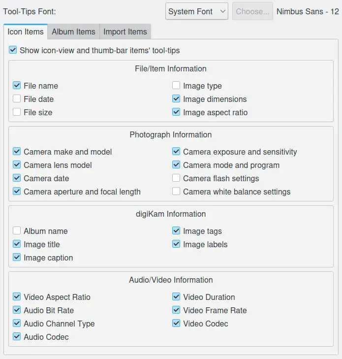 As opções de Dica para o digiKam são definidas em . As opções nesta página controlam quais informações são exibidas quando o mouse passa sobre uma miniatura de arquivo na área de imagem. Cada caixa de seleção ativa ou desativa a exibição das informações especificadas. A fonte e o tamanho da dica de ferramenta podem ser selecionados na opção de fonte existente na parte superior à direita.