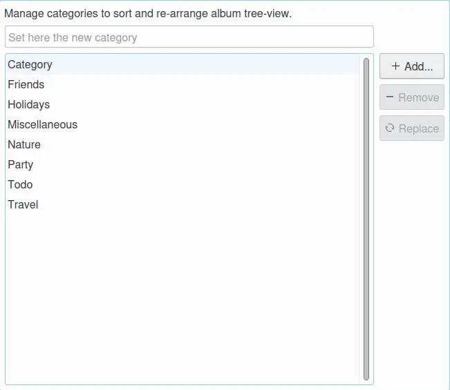 Na vista de álbuns, você pode escolher entre para que os álbuns na árvore de álbuns da barra lateral esquerda sejam ordenados por categoria. Aqui, você pode gerenciar essas categorias usando os botões Adicionar, Remover e Substituir. Use o botão Substituir para renomear uma categoria. Para atribuir categorias a um álbum, você deve usar a caixa de diálogo Propriedades do álbum.