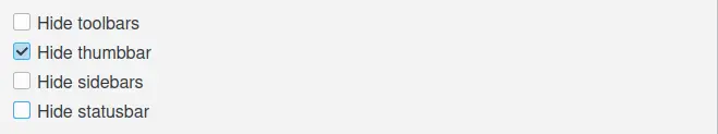As opções nesta aba se aplicam apenas ao modo de tela cheia, que você pode acessar através do botão Tela cheia na barra de ferramentas ou através de Ctrl-Shift-F no menu principal ou no menu de contexto. Não se aplica ao Modo de tela cheia que você acessa clicando no ícone “Mostrar em tela cheia” em uma miniatura ou na visualização.
