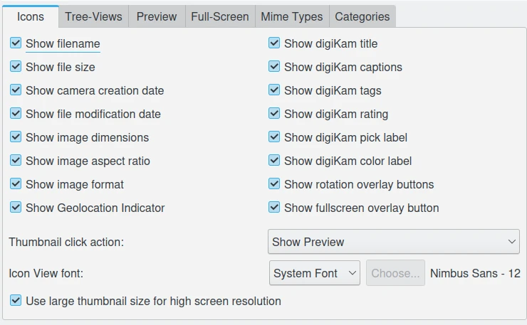 As opções das Vistas para o digiKam são definidas em . Nesta página de configuração, você pode personalizar as configurações das vistas do digiKam, agrupadas nas seguintes categorias: Miniaturas, Vistas em árvore, Visualização, Tela cheia, Tipos MIME e Categorias.
