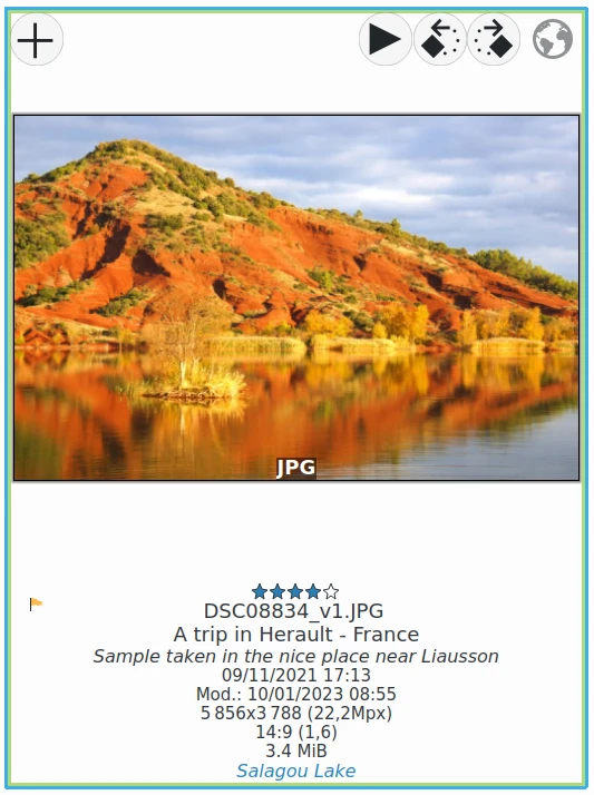A opção A visualização mostra a visualização embutida, se disponível tentará abrir uma versão reduzida da fotografia embutida no arquivo. Imagens embutidas pequenas podem ser encontradas em todos os arquivos RAW e em todos os arquivos compatíveis com IPTC ou XMP, como PNG, JPEG, TIFF, JPEG2000 e PGF. Se uma visualização embutida não for encontrada, alguns decodificadores de imagem (JPEG, JPEG2000 e PGF, WebP) conseguem criar uma versão reduzida da fotografia por conta própria, o que ainda é mais rápido do que usar a imagem completa. Dependendo do tamanho da imagem, do tamanho da visualização embutida e do tamanho disponível para a visualização na tela, o efeito desta opção pode ou não ser evidente.