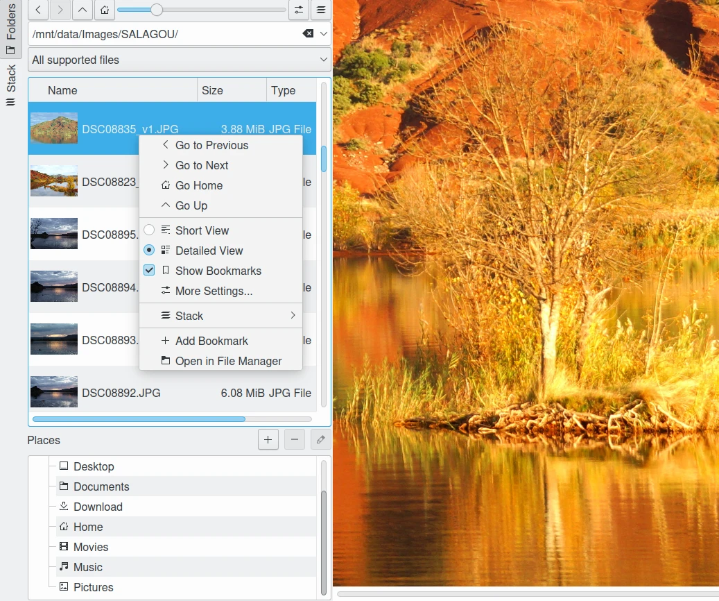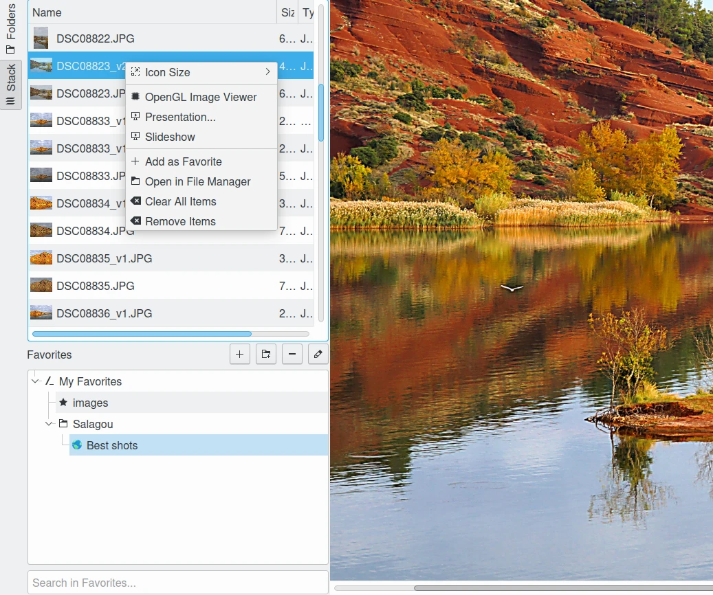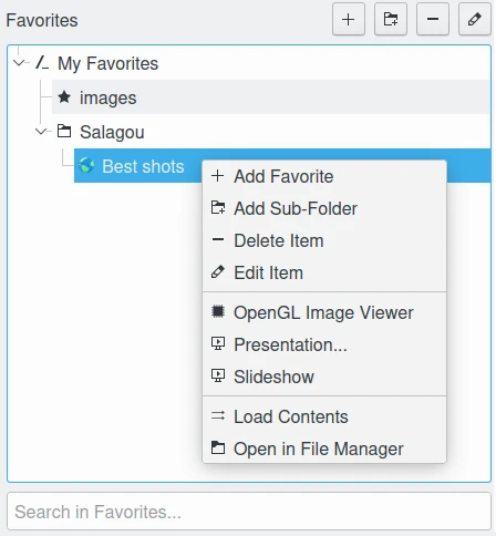 A visualização em árvore dos Favoritos é uma lista das pilhas preferidas, classificadas usando uma hierarquia (semelhante às etiquetas no digiKam). Essa hierarquia pode ser aninhada em Meus favoritos para hospedar suas pilhas (Item favorito). Você pode editar as propriedades da pilha, que incluem Nome, Tipo, Descrição, Data de criação, Ícone e a lista de Itens empilhados. Clicar duas vezes em um item da hierarquia insere o conteúdo da pilha no topo da lista de miniaturas e carrega o último arquivo aberto da pilha na tela. Se não houver nenhum último arquivo aberto, o primeiro item da lista será carregado na tela.