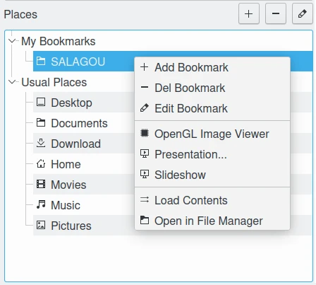 Os Favoritos e Locais habituais preferidos. Esta visualização é opcional e pode ser desativada nas configurações disponíveis no menu de contexto da lista de miniaturas ou na barra de ferramentas na parte superior. Favoritos refere-se aos seus locais preferidos (pastas) que você pode salvar ao navegar nas hierarquias de pastas. As propriedades de Favoritos incluem um Caminho, um Ícone e um Título. Essas propriedades podem ser modificadas posteriormente, conforme desejar. Locais habituais é um grupo somente leitura que fornece acesso rápido às pastas padrão da sua pasta pessoal.