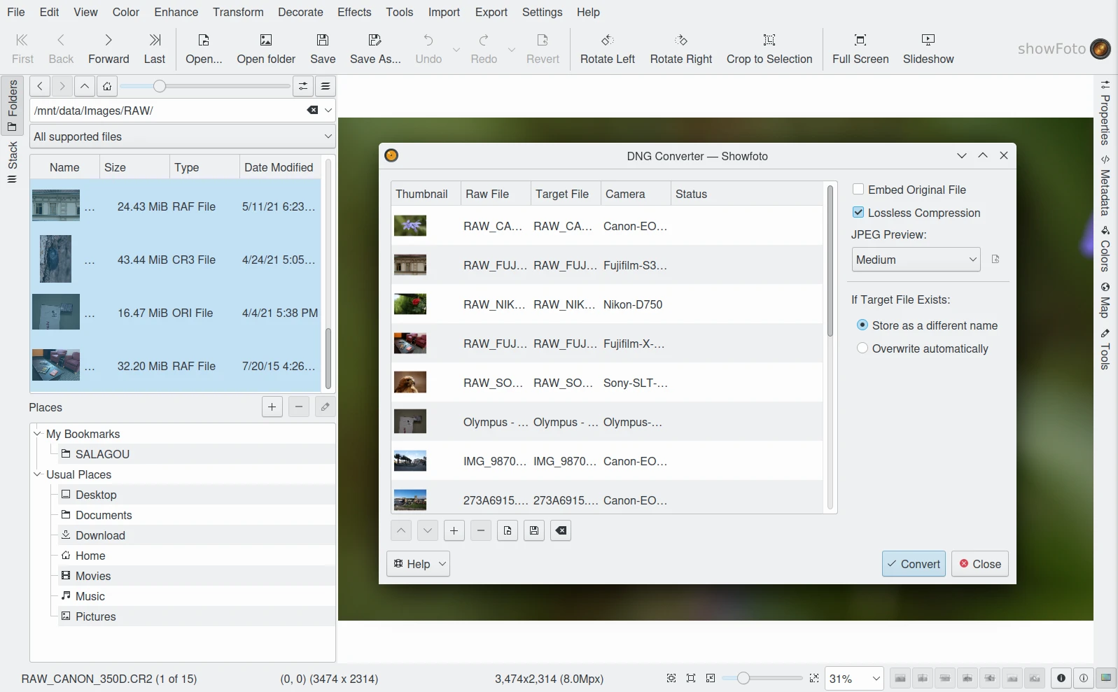 Uma ferramenta muito importante disponível no gerenciador de processamento em lote do digiKam também pode ser usada no Showfoto. É o famoso Conversor para DNG, usado para migrar contêineres de dados RAW proprietários para o formato Digital Negative, padronizado de forma aberta.