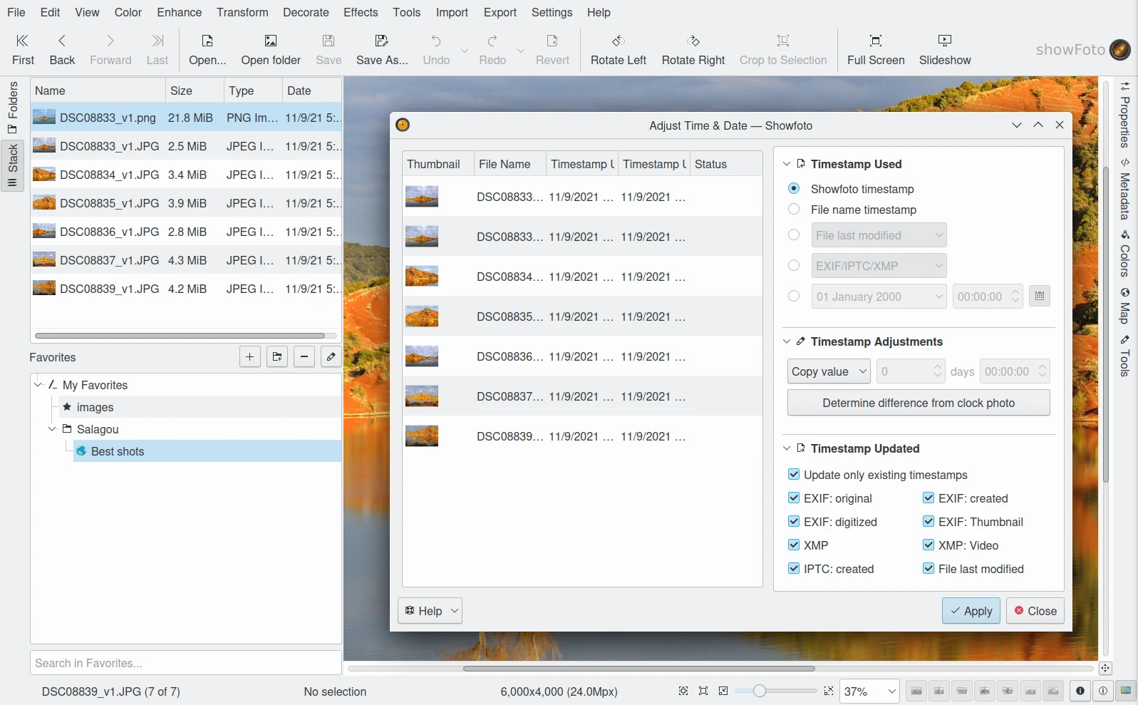 Mesmo que o Showfoto não ofereça algo como o Gerenciador de processamento em lote do digiKam, ele pode processar arquivos em lote. Plugins como Ajuste de data e hora, Assistente de impressão, Editor de metadados, Galeria HTML etc. são compatíveis com o Showfoto. A principal diferença entre essas ferramentas e o digiKam é a forma como os itens são passados para as ferramentas para processamento. O Showfoto não possui uma vista de miniaturas como o digiKam, mas possui os contêineres Vista de pilha e Barra de miniaturas. Quando uma ferramenta de Pós-Processamento é chamada no Showfoto, o conteúdo da Pilha ou da Barra de miniaturas é carregado na ferramenta e, claro, você pode fazer ajustes nessa lista posteriormente no plugin.