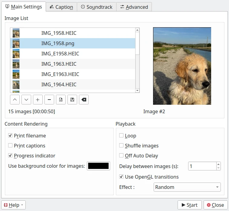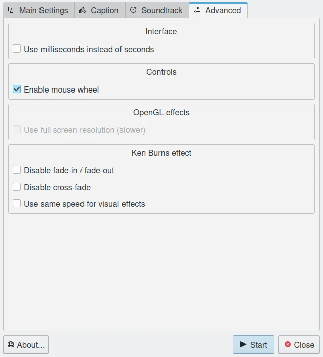 A caixa de seleção Usar transições do OpenGL permite transições de imagem muito suaves usando o modo de exibição OpenGL. Certifique-se de que o OpenGL esteja habilitado na sua placa de vídeo, caso contrário, a apresentação de slides ficará muito lenta.