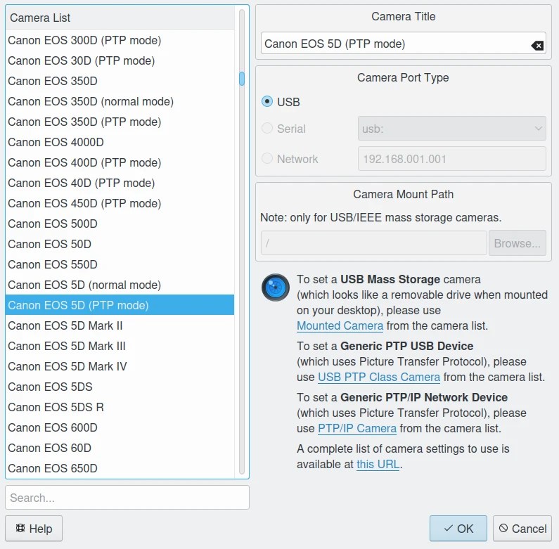 A janela de configuração do digiKam para configurar um dispositivo de câmera pelo gPhoto¶