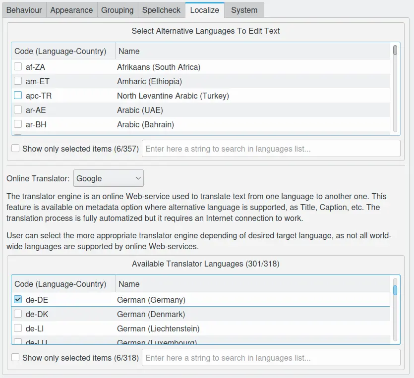 Each list has a huge number of entries, so a search engine is available to quickly find a language, along with an option to show only the current selection.